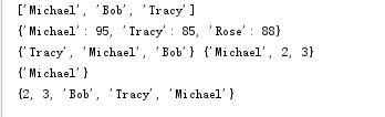l=['Michael','Bob','Tracy'] l.append('Bob') l.pop() print(l) t = ('Michael', 'Bob', 'Tracy') scores=[95 ,75 ,85] d = {'Michael':95, 'Bob':75, 'Tracy':85} d['Bob']= 82 d['Rose']= 88 d.pop('Bob') print(d) s1={'Michael', 'Bob', 'Tracy'} s2={'Michael',2,3} print(s1,s2) print(s1 & s2) print(s1 | s2)