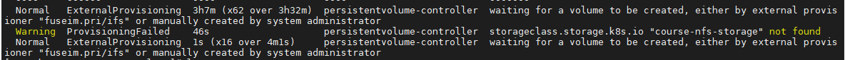 kubectl describe命令查看错误提示信息,信息中有:waiting for a volume to be created, either by external provisioner “fuseim.pri/ifs” or manually created by system administrator。 -