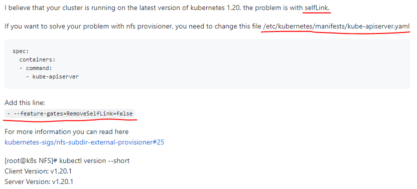 kubectl logs命令查看pod(nfs-client-provisioner)日志,日志中有:unexpected error getting claim reference: selfLink was empty, can’t make reference。 -