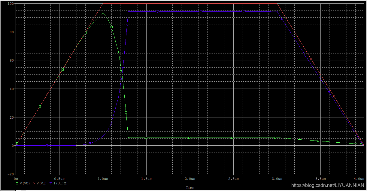 图4 仿真结果(红色为模拟的输入电压脉冲,蓝色为流过放电管的电流,绿色为负载电压)
