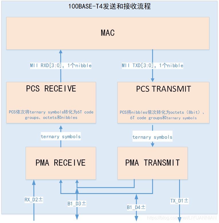 1)MAC送过来的nibbles(4个bit)存入寄存器(tsr和ohr),PCS TRANSMIT按照octets读取,然后使用8B6T编码表将octets编码为6T code groups(被称为ternary symbols),存入寄存器(ohr),再传送给PMA,因为MDI需要3路传输数据,所以6T code groups会分三路扇出到TX_D1±、B1_D3±、B1_D4±差分对上,每个差分对上的ternary symbols的传输速率为25MHz,RX_D2±只用于载波检测。