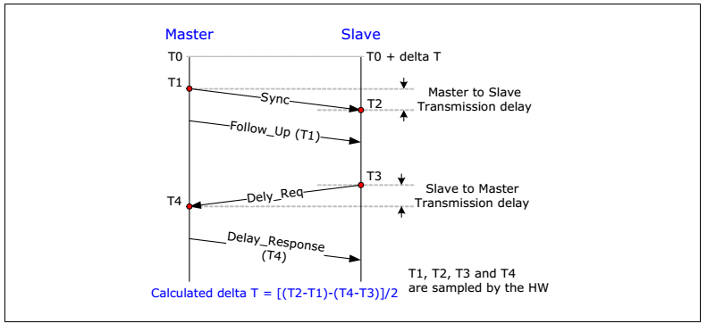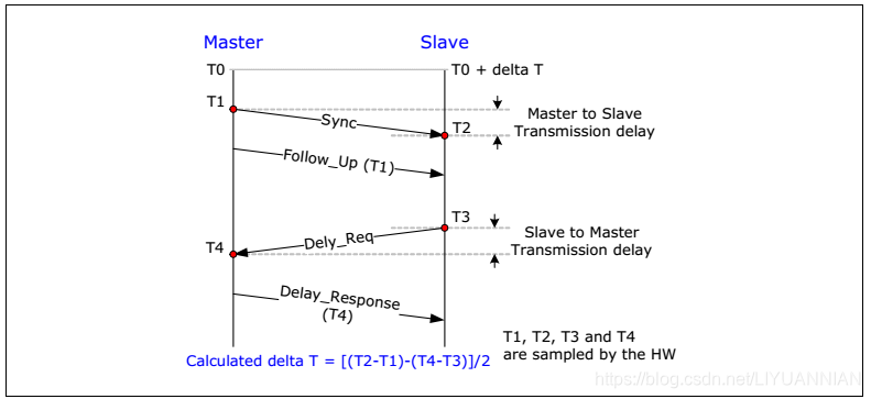 master软件发送Sync packets,通知master硬件记录发送时间T1,slave软件通知slave硬件记录接收时间T2,master再发送Follow_Up packets,里面会携带T1,slave软件之后会返回Delay_Req packets,slave硬件会记录发送时间T3,master软件接收到Delay_Req packets后,通知master硬件记录接收时间T4,master软件再发送Delay_Response packets,里面会携带T4,slave软件接收到该packets后,它就获取到了T1、T2、T3和T4,根据下面的公式可以计算出slave需要调整的时间,最终实现时间同步。