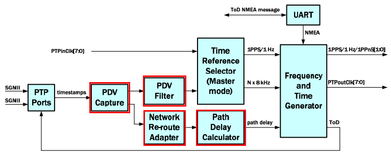 - 当ACS9521工作在master模式,Frequency and Time Generator产生的PTPoutClk[3:0]与1PPS/1Hz/1PPns[1:0]时间同步,后者与PTPInClk[7:0]中的一个时间同步,所以最终,这三个都是时间同步的。