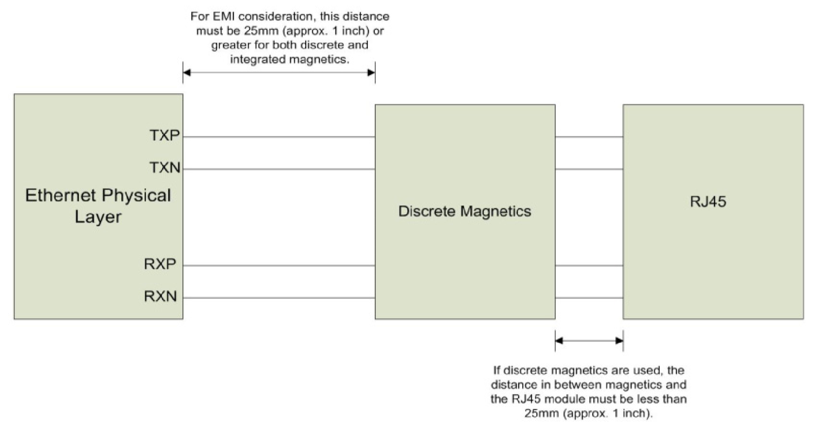 1. PHY距离网络变压器的距离要≥25mm,以便于将PHY和网络变压器有效隔离,减少EMI干扰,见下图。