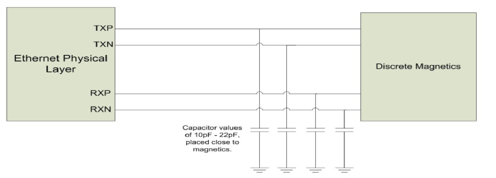 4. 差分线上的共模电容用于高频衰减,共模电容靠近网络变压器摆放,见下图。