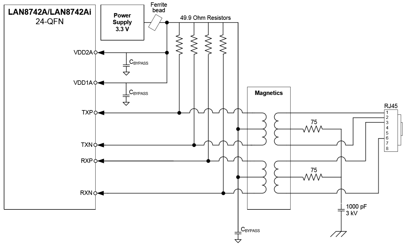 图5 分布式网络变压器的Layout说明(来自于LAN8742A手册)