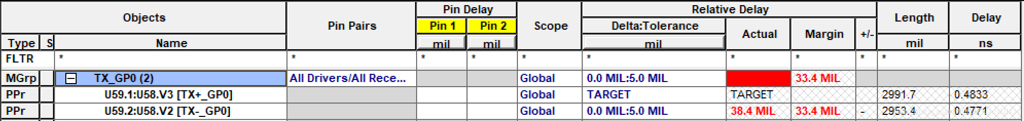 上图可以看出,匹配组TX_GP0中的差分线组员TX-_GP0以TX+_GP0为TARGET,TX-_GP0的Actual值为38.4mil,+/-列为-,意味着TX-_GP0的Total Etch Length比TX+_GP0的Total Etch Length短了38.4mil。