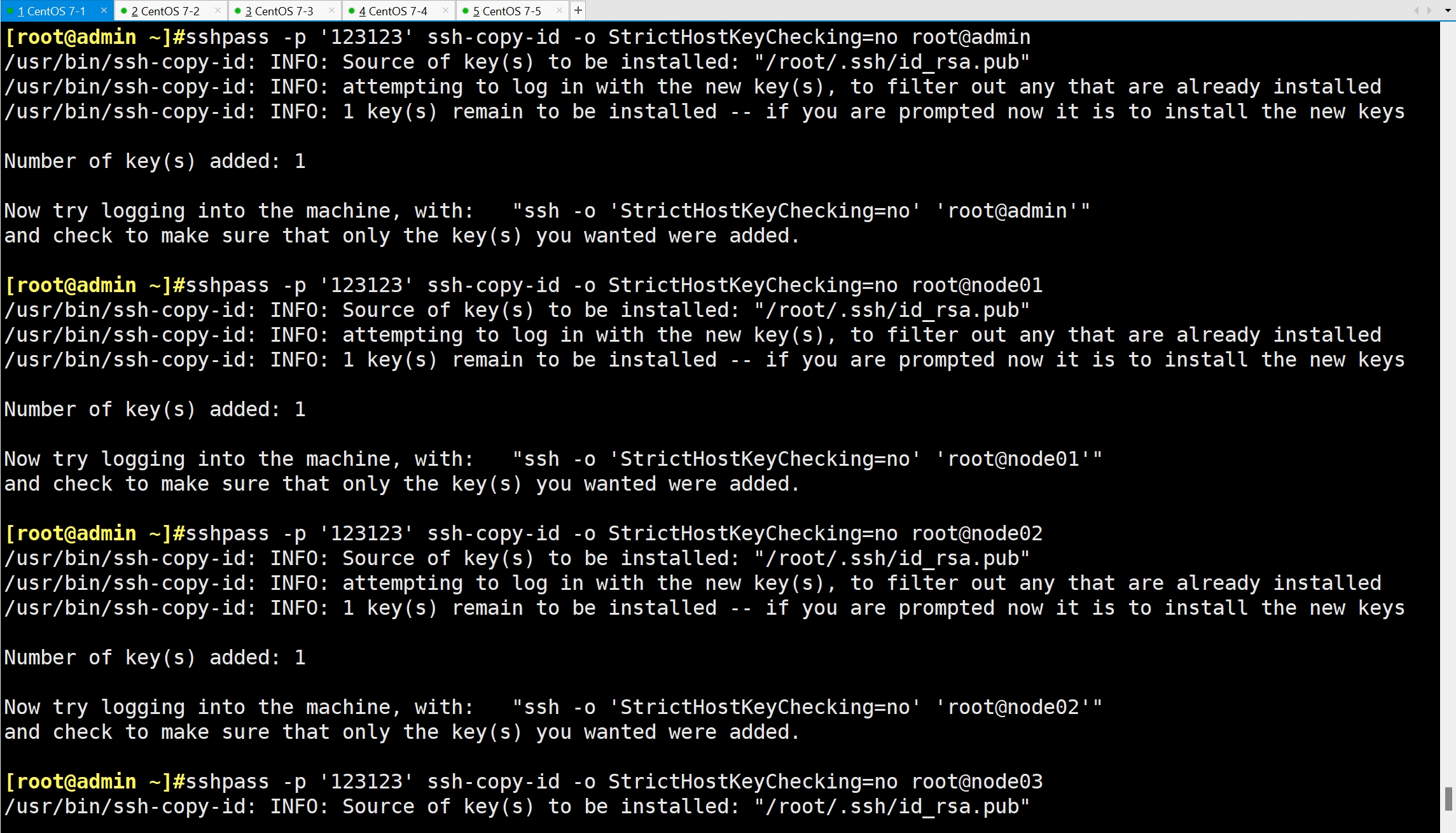 sshpass -p '123123' ssh-copy-id -o StrictHostKeyChecking=no root@node01
