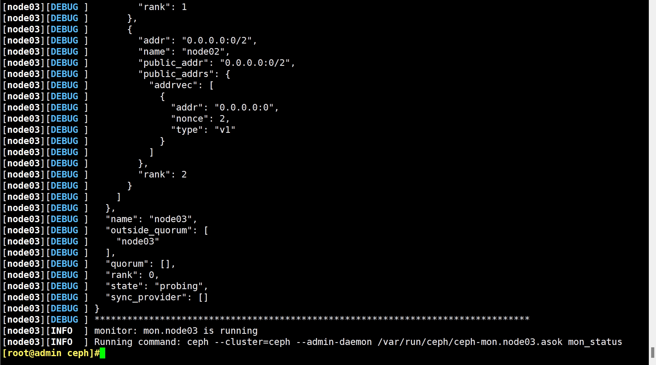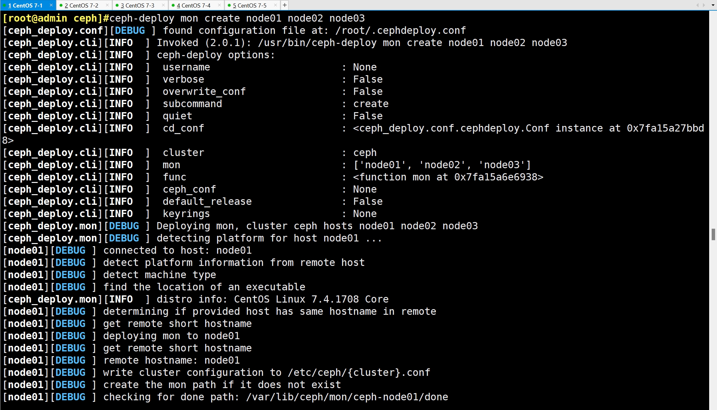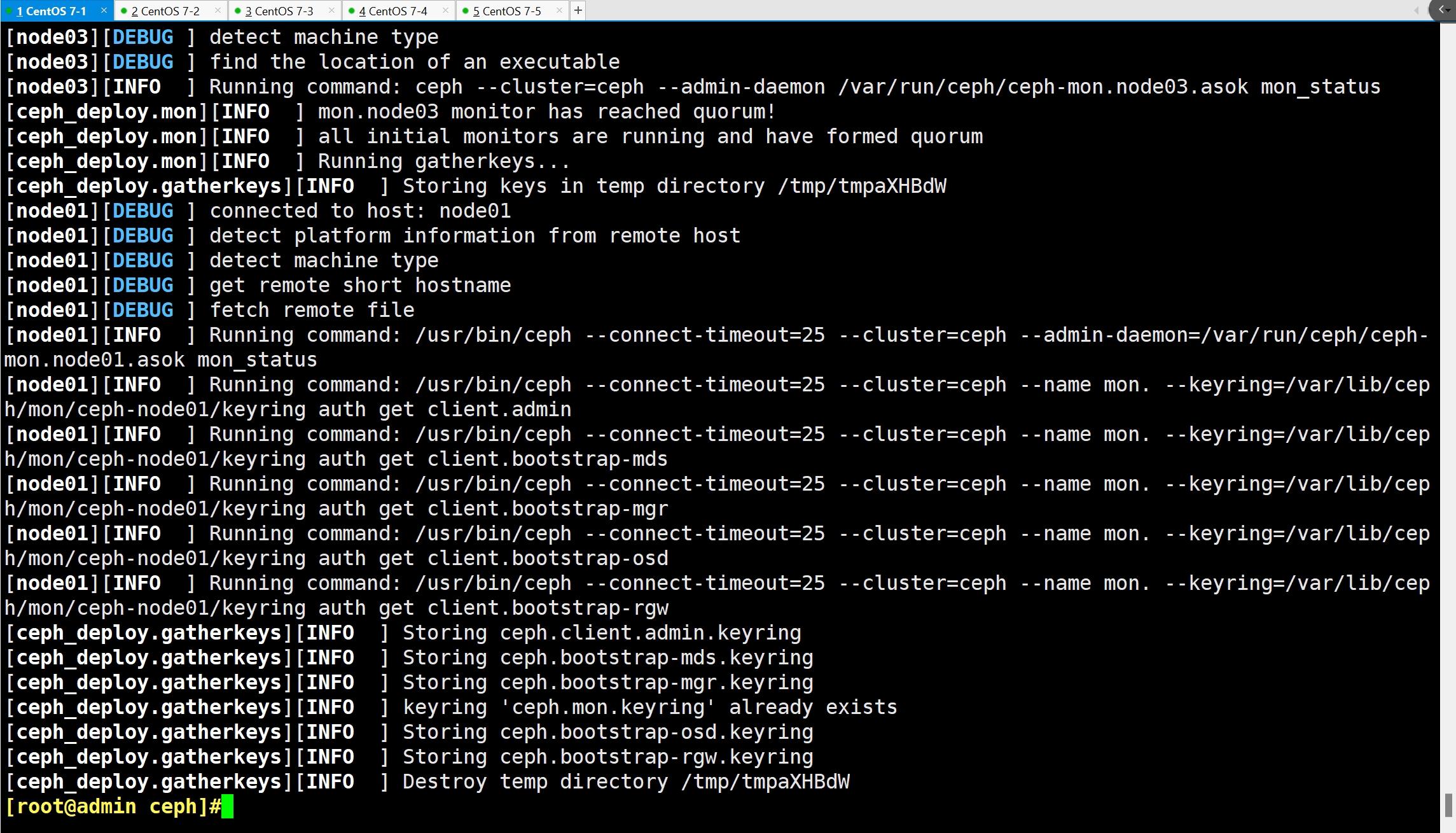 ceph-deploy mon create node01 node02 node03 #创建 mon 节点,由于 monitor 使用 Paxos 算法,其高可用集群节点数量要求为大于等于 3 的奇数台