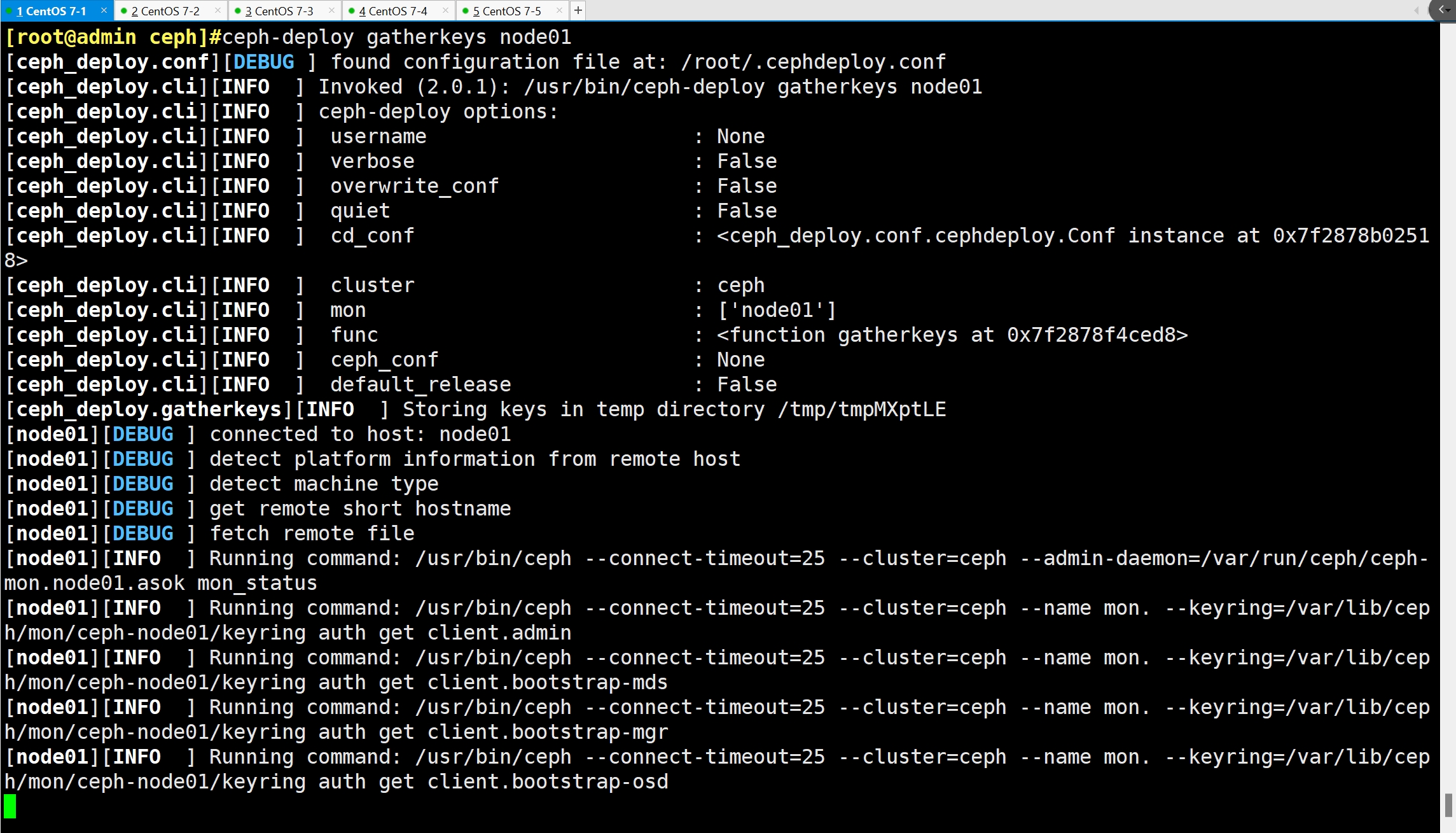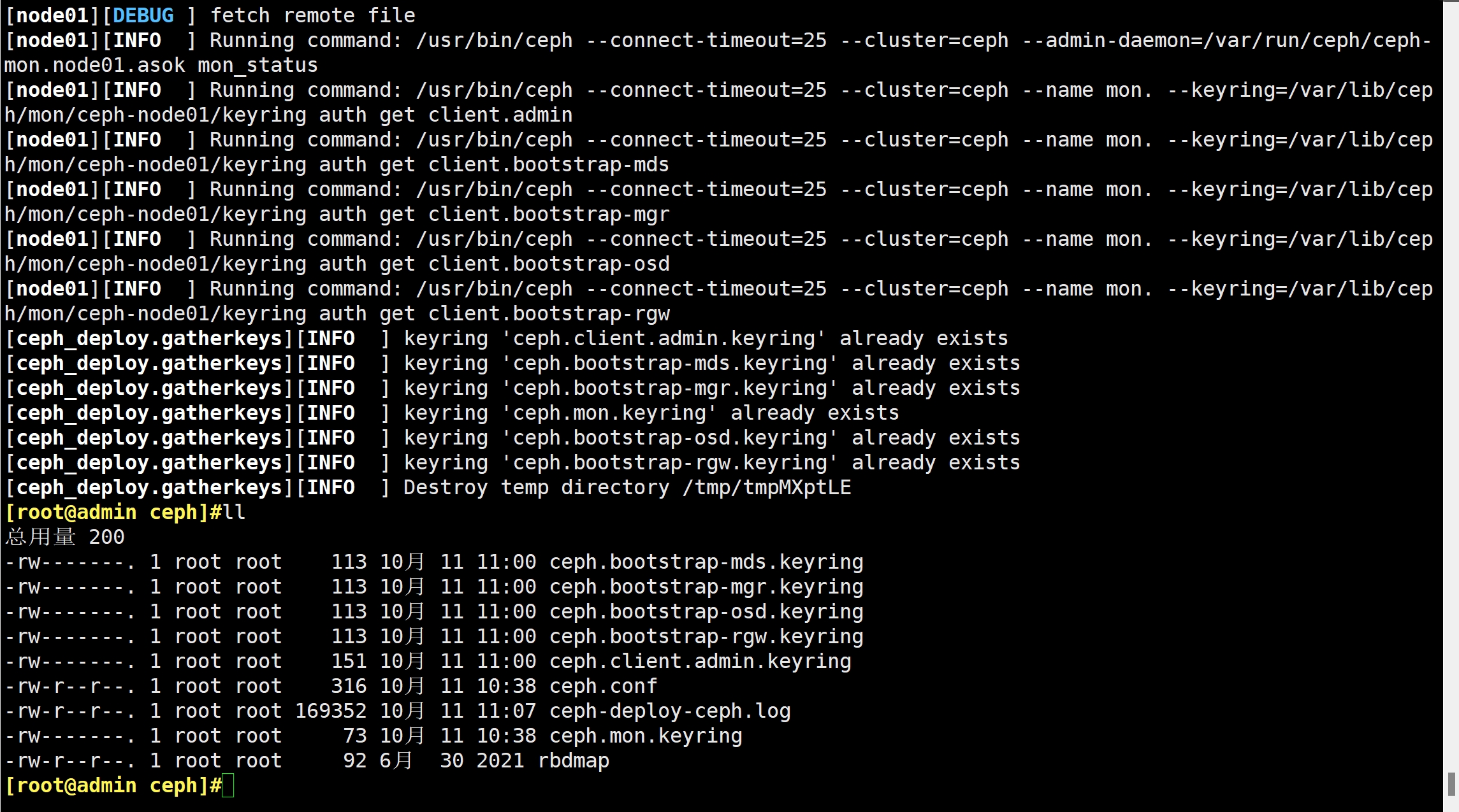 ceph-deploy gatherkeys node01 #可选操作,向 node01 节点收集所有密钥