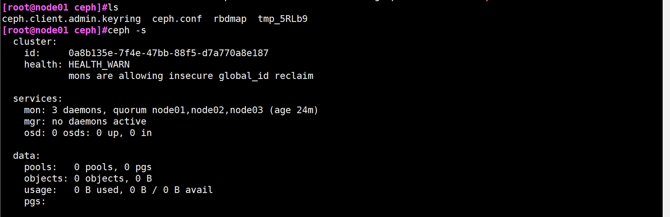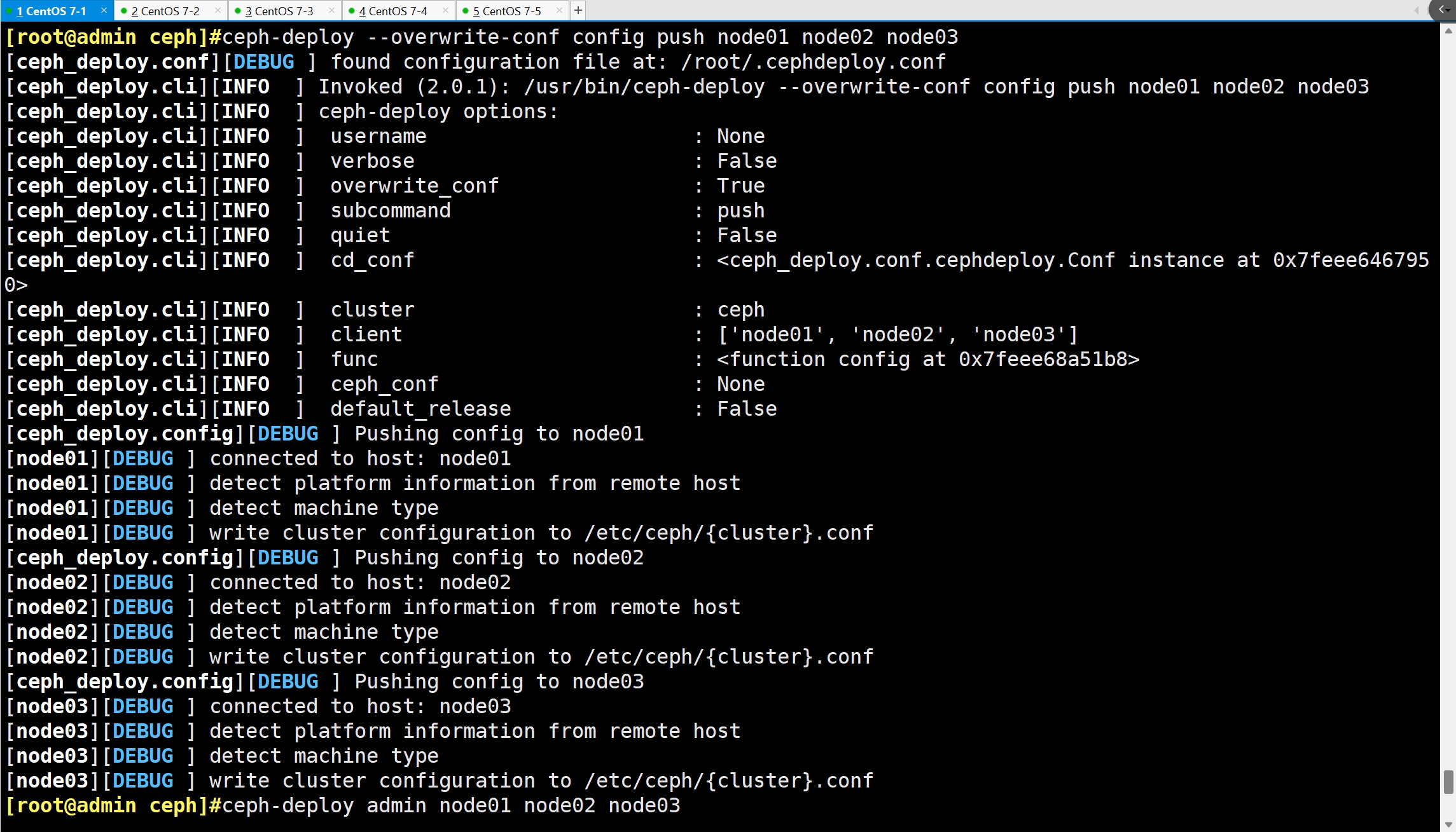 ceph-deploy --overwrite-conf config push node01 node02 node03 #向所有 mon 节点同步配置,确保所有 mon 节点上的 ceph.conf 内容必须一致