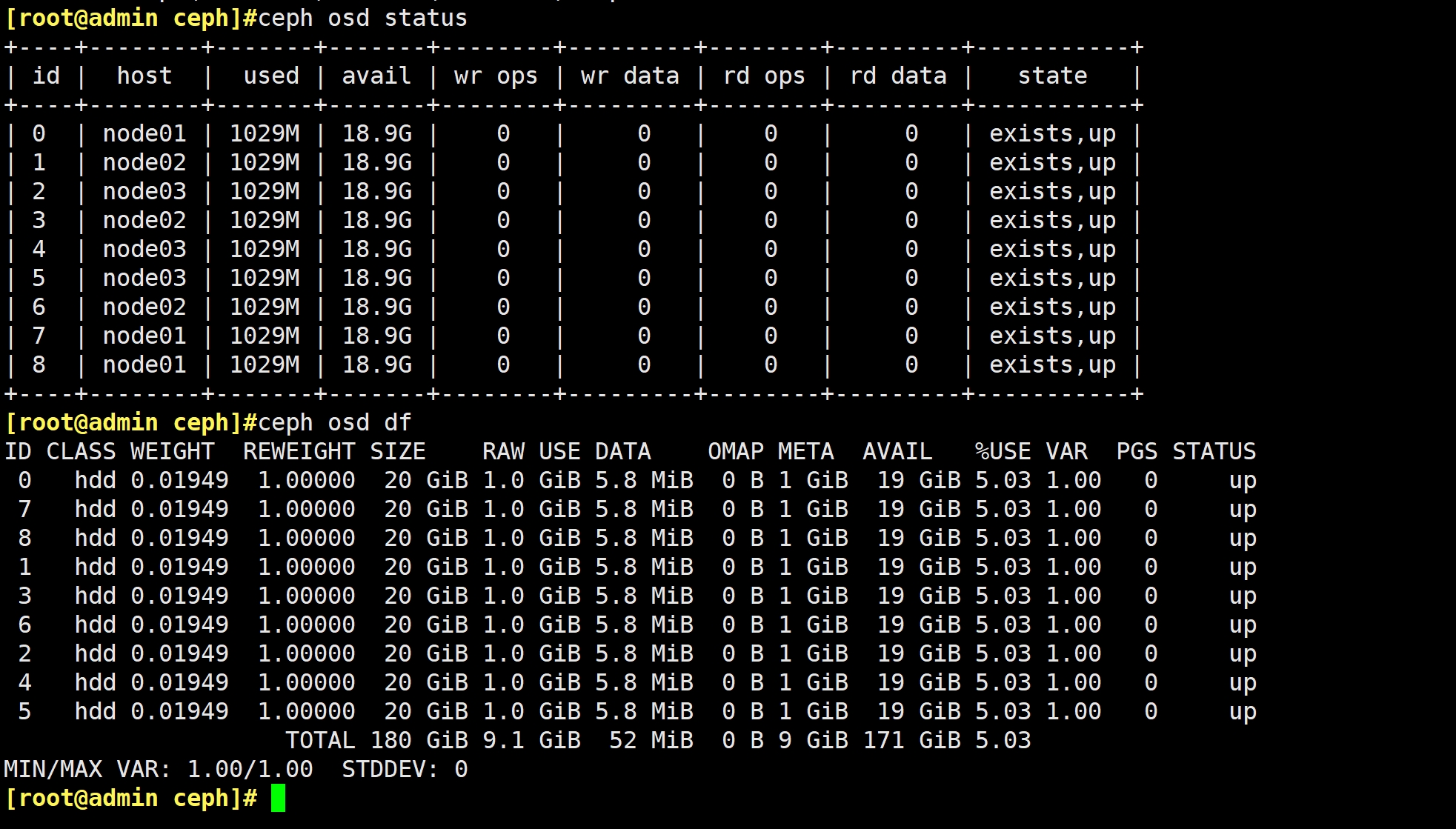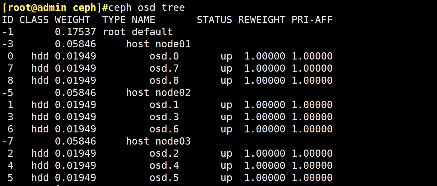 ceph osd status #查看 osd 状态,需部署 mgr 后才能执行