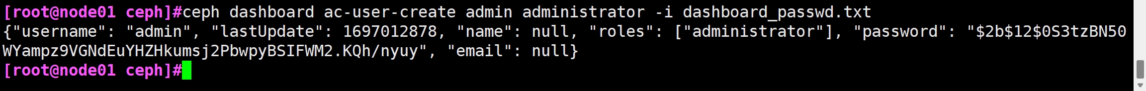 ceph dashboard ac-user-create admin administrator -i dashboard_passwd.txt