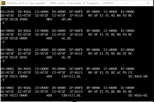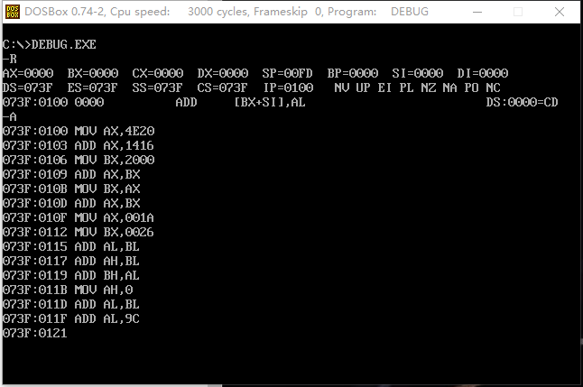任务:使用debug,将下面的程序段写入内存,逐条执行,观察每条指令执行后,CPU中相关寄存器中内存的变化。