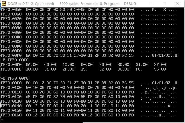PC机主板上的ROM中写有一个生产日期,在内存FFF00H-FFFFFH的某几个单元中,请找到这个生产日期并试图修改它。