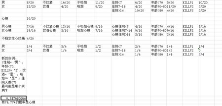 新的实例:–(性别=‘男’,年龄<70, KILLP=‘I',饮酒=‘是’,吸烟≈‘是”,住院天数<7)