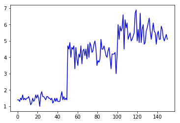 plt.plot(np.linspace(0,150,num=150),datas,'b')