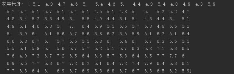 data_len=np.array(list(len[2] for len in iris['data'])) print(data_len) print(np.max(data_len)) print(np.mean(data_len)) print(np.median(data_len)) print(np.std(data_len))