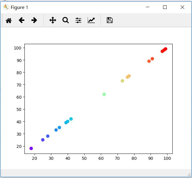 import matplotlib.pyplot as plt plt.scatter(x, x, c=x, s=50, cmap="rainbow"); plt.show()