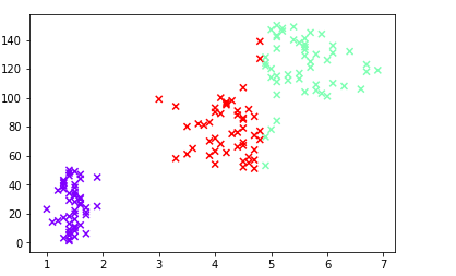 from sklearn.datasets import load_iris from sklearn.cluster import KMeans import matplotlib.pyplot as plt import numpy as np # 用sklearn.cluster.KMeans,鸢尾花花瓣长度数据做聚类并用散点图显示. data=load_iris() data_length=data['data'][:,2:3]#取出鸢尾花花瓣的长度 x=data_length #y=np.zeros(x.shape[0]) k1=KMeans(n_clusters=3)#将其类别分为3类 k1.fit(x) kc1=k1.cluster_centers_ y_kmeans=k1.predict(x)##预测每个样本的聚类索引 print(y_kmeans,kc1) plt.scatter(x,np.linspace(1,150,150),c=y_kmeans,marker='x',cmap='rainbow',linewidths=4) plt.show()