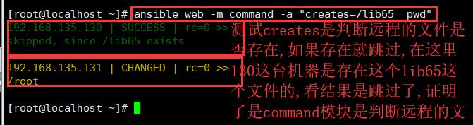 chdir #切换目录 creates # 如果存在,就不执行,如果不存在,就执行 removes # 如果不存在,就不执行,如果存在,就执行 ansible web -m command -a "pwd" ansible web -m command -a "ls /tmp" ansible web -m command -a "chdir=/tmp pwd" # 切换目录,一般做编译安装 ansible web -m command -a "creates=/tmp pwd" # 不被执行,因为/tmp已经存在, ansible web -m command -a "creates=/tmp2 pwd" # 被执行,因为/tmp2目录不存在 ansible web -m command -a "creates=/tmp2 mkdir /data" # 会被执行,因为/tmp2目录不存在 ansible web -m command -a "removes=/tmp2 pwd" # 不被执行,因为/tmp2目录不存在 ansible web -m command -a "removes=/tmp pwd" # 会被执行,因为/tmp已经存在,