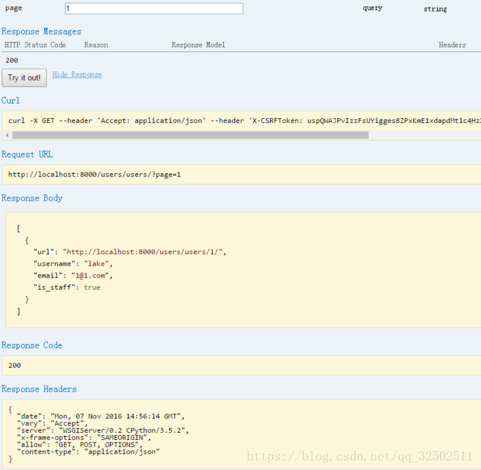 # 为了简单,我们直接利用Django自身的基本用户模型生成api接口 # just inline a simple api endpoint at 'users/' that exposes Django's base User model from django.conf.urls import url, include from django.contrib.auth.models import User from rest_framework import routers, serializers, viewsets from rest_framework.schemas import get_schema_view from rest_framework_swagger.renderers import SwaggerUIRenderer, OpenAPIRenderer from django.contrib import admin # Serializers define the API representation. class UserSerializer(serializers.HyperlinkedModelSerializer): class Meta: model = User fields = ('url', 'username', 'email', 'is_staff') # ViewSets define the view behavior. class UserViewSet(viewsets.ModelViewSet): """ retrieve: Return a user instance. list: Return all users, ordered by most recently joined. create: Create a new user. delete: Remove an existing user. partial_update: Update one or more fields on an existing user. update: Update a user. """ queryset = User.objects.all() serializer_class = UserSerializer # Routers provide an easy way of automatically determining the URL conf. router = routers.DefaultRouter() router.register(r'users', UserViewSet) # Create our schema's view w/ the get_schema_view() helper method. Pass in the proper Renderers for swagger schema_view = get_schema_view(title='Users API', renderer_classes=[OpenAPIRenderer, SwaggerUIRenderer]) # Wire up our API using automatic URL routing. # Additionally, we include login URLs for the browsable API. urlpatterns = [ url(r'^docs/', schema_view, name="docs"), url(r'^api/', include(router.urls)), url(r'^api-auth/', include('rest_framework.urls', namespace='rest_framework')), url(r'^admin/', admin.site.urls), ]