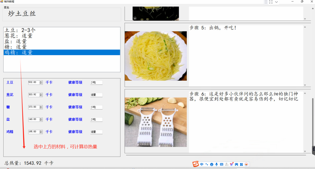 选中对应的材料信息,会把当前菜单的总热量汇总在一起。
