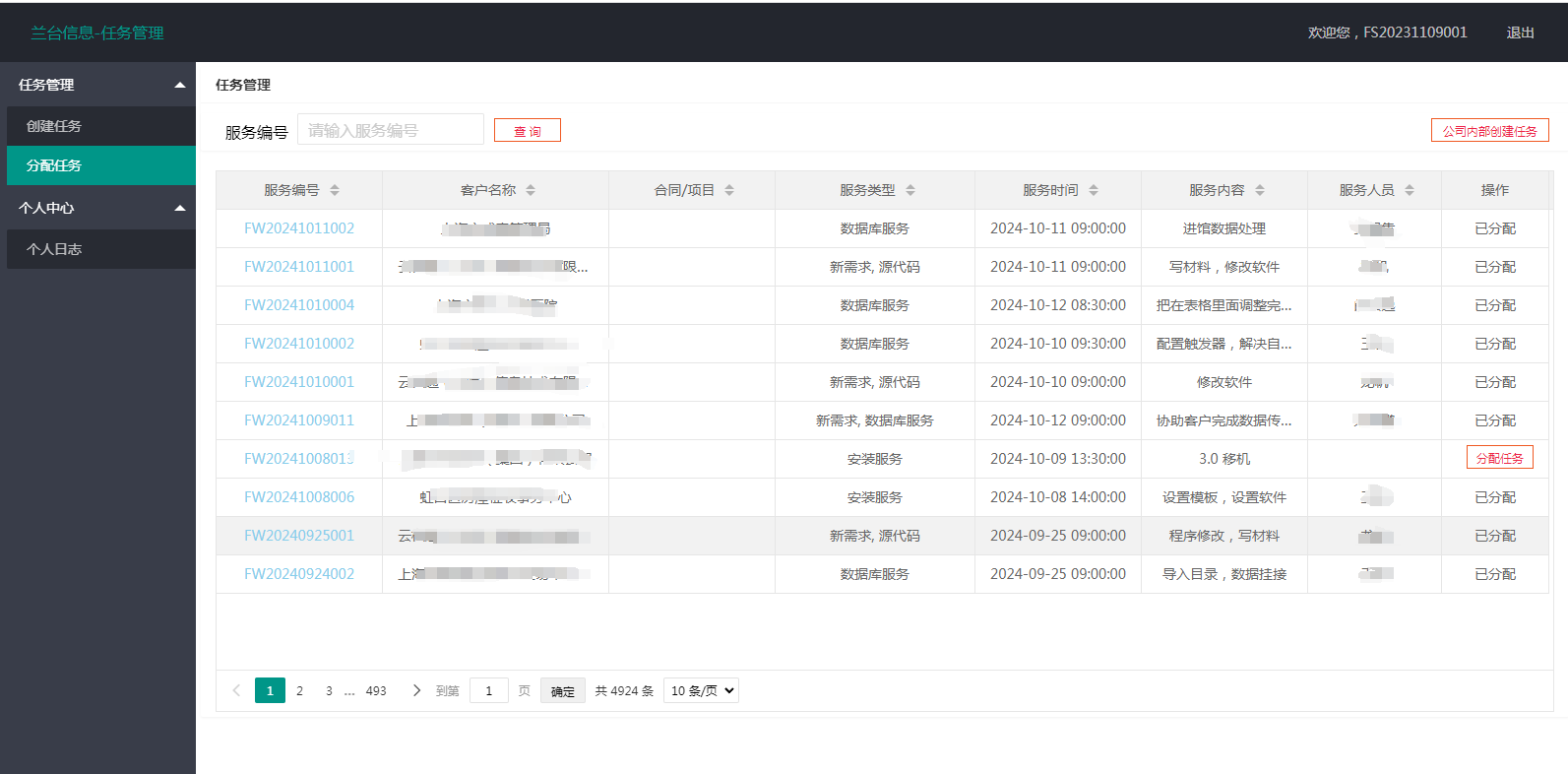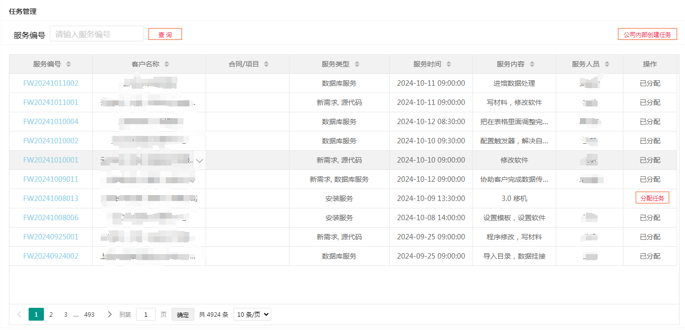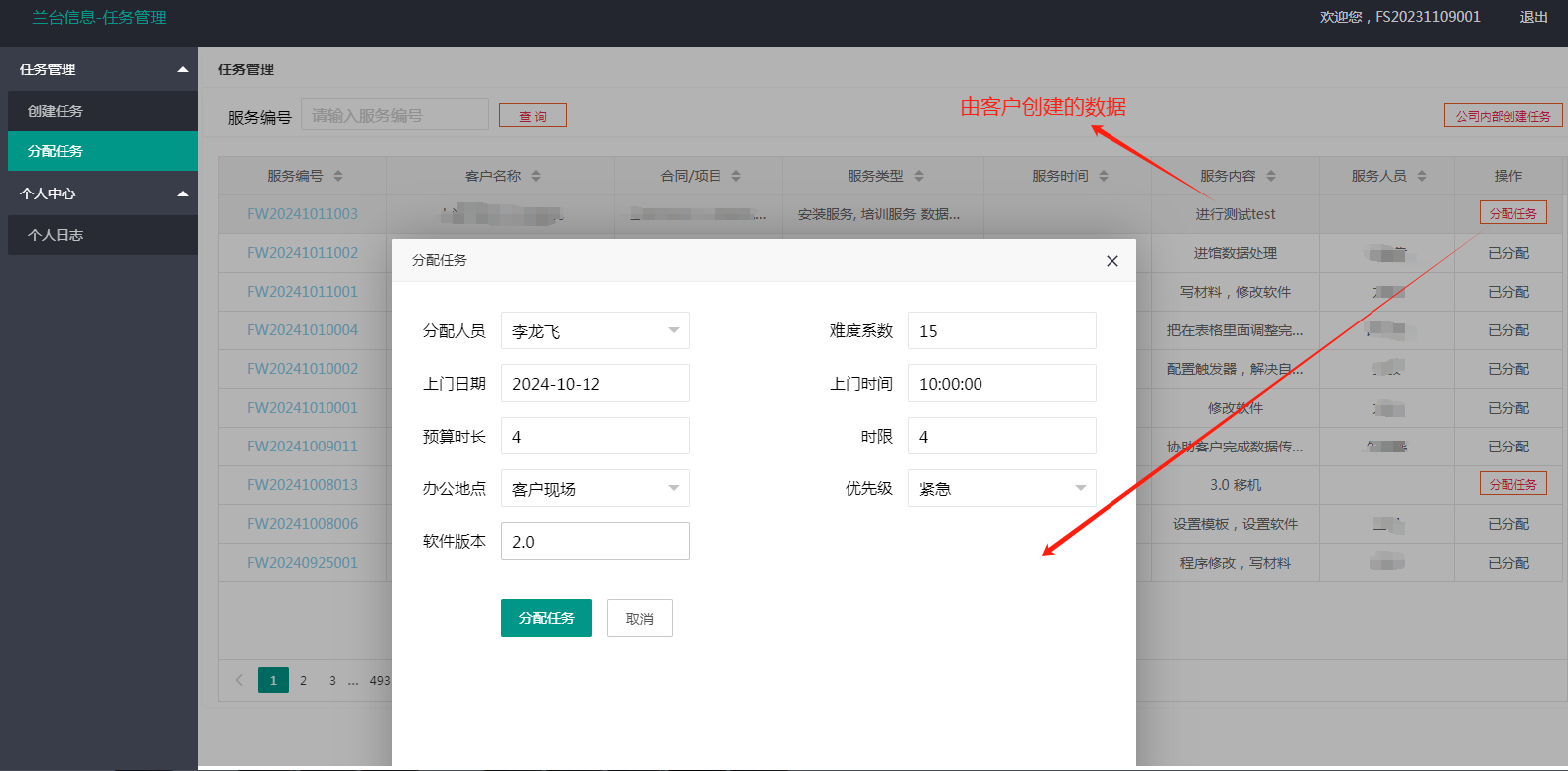 客户创建完任务之后,会生成一个服务编号发送到公司,公司审核人员拿到这个表单之后,可以进行分配任务。