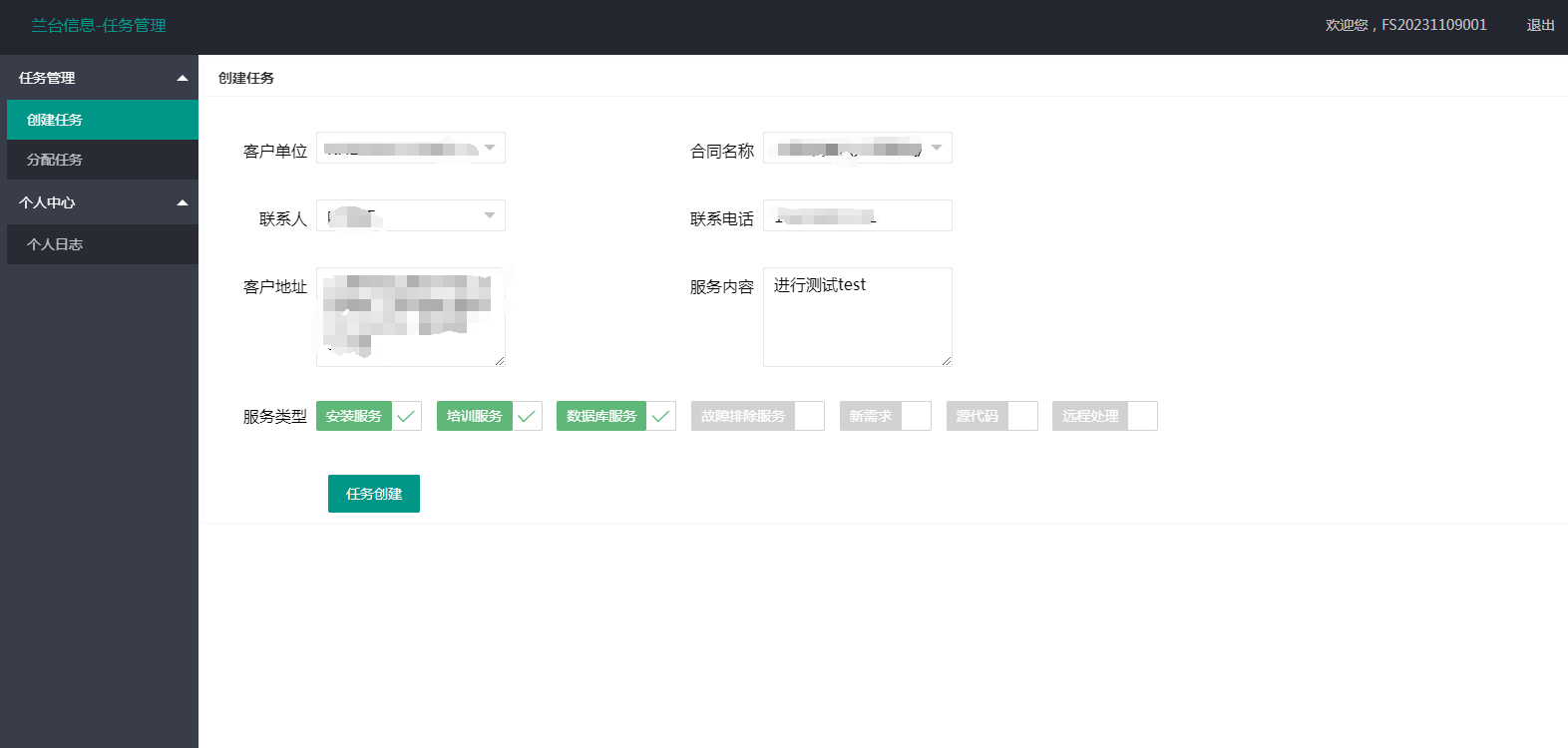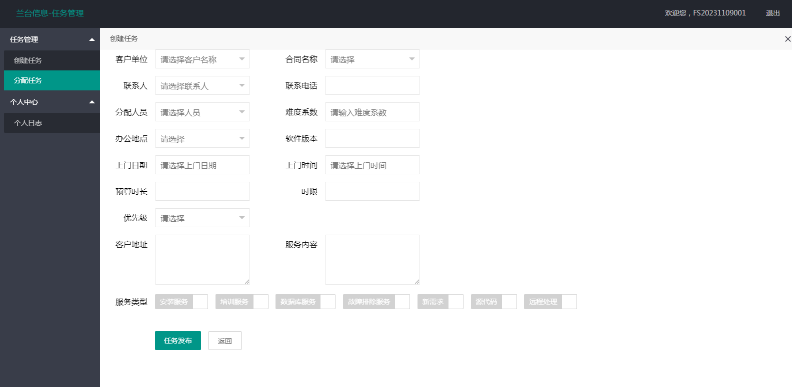 任务表单主要是有:客户单位、合同名称、联系人、联系电话、分配人员、上门日期、客户地址、服务内容、服务类型这些字段进行创建。