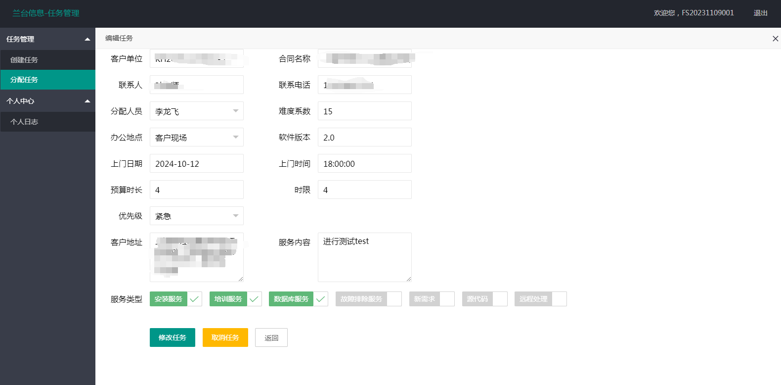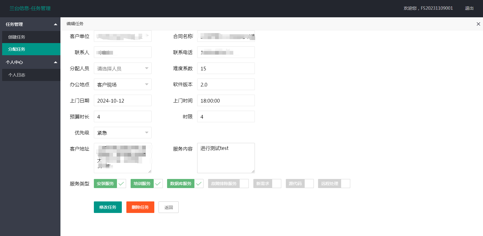 当操作按钮就是‘分配任务’的情况下:点击任务单号,会进入这个服务单的详细信息,在这个表单中可以进行修改任务和删除任务