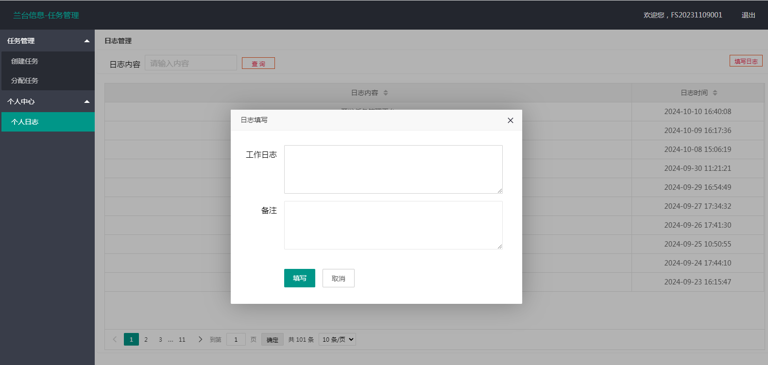用于显示员工的每天日志记录,主要有创建时间、日志内容。具有日期搜索和内容搜索的功能。