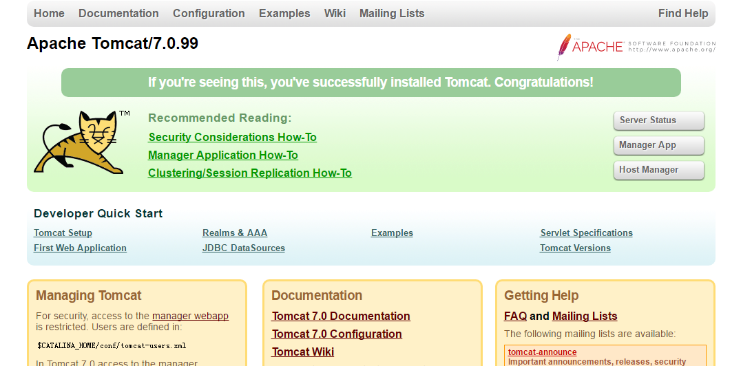 出现上面tomcat主页画面则证明tomcat已安装完成。