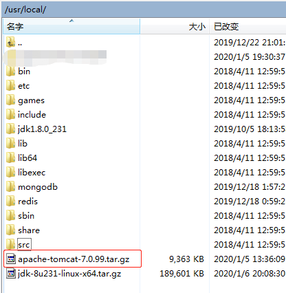 2. 上传压缩包至服务器中,上传目录可以自己创建也可以直接放到local目录下,这里以直接放在/usr/local目录下为例。