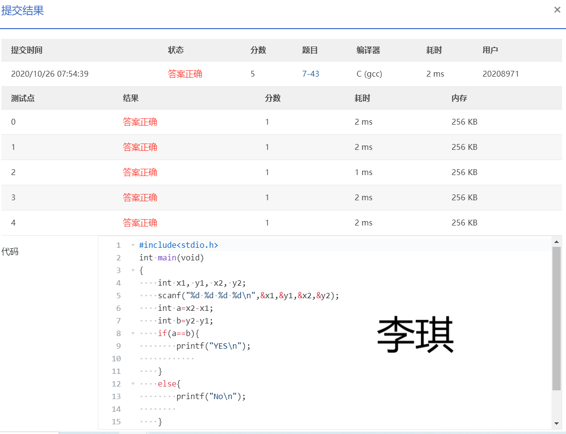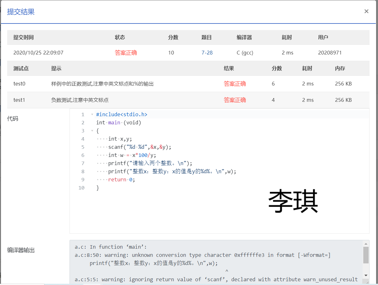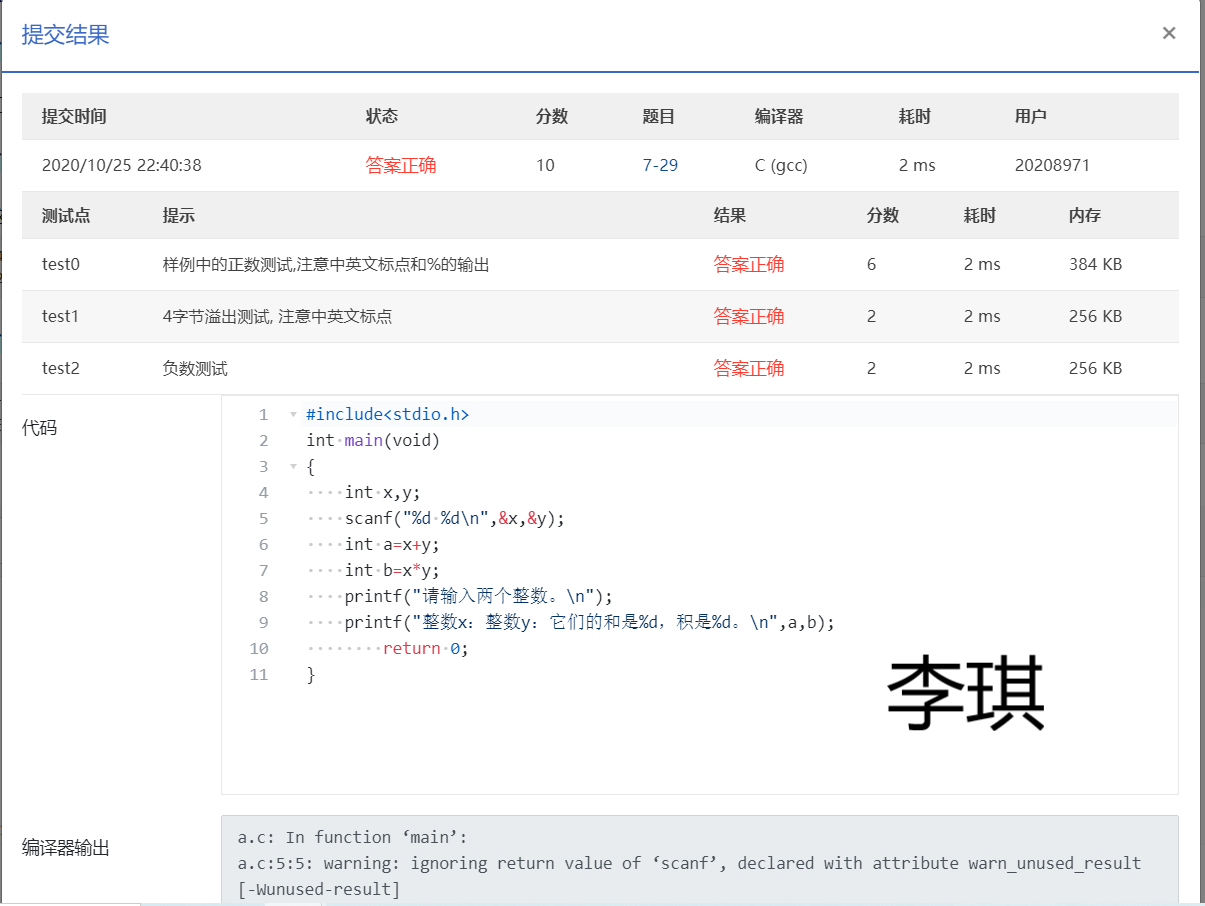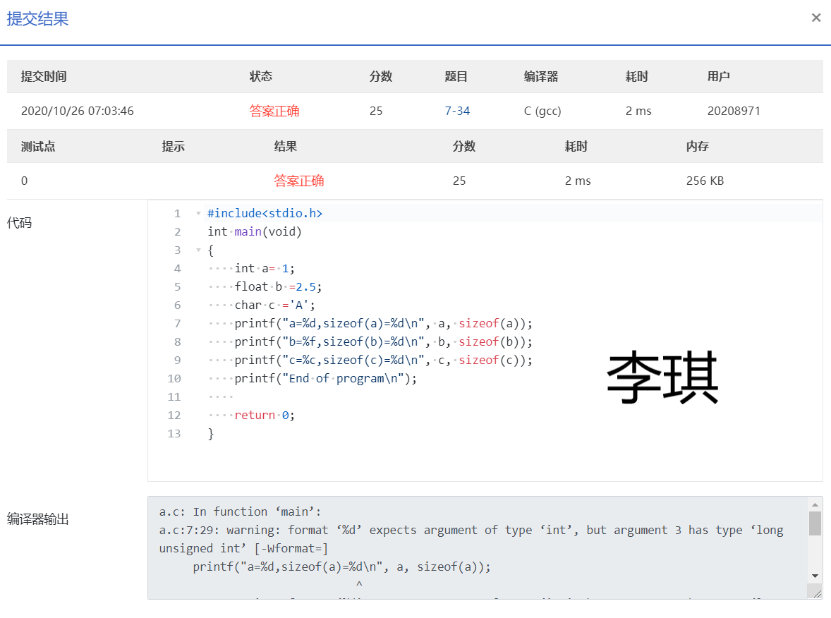 2.3 请完成PTA作业:2020秋C语言作业2。在博客作业中贴出完成图片,图片要求存在自己的名字标识。(2分)