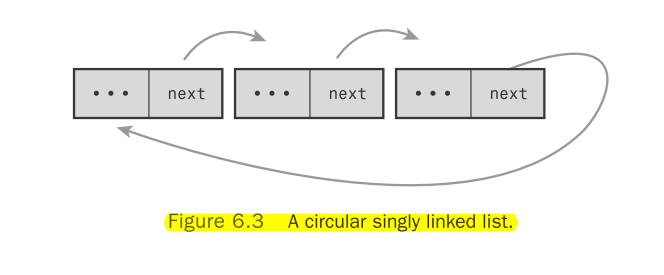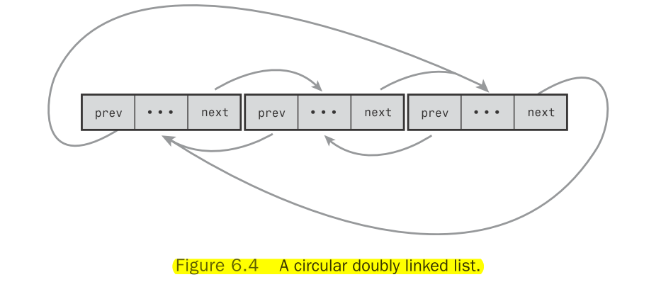 链式结构的数据是在不同的时期创建的,他们可能存放在并不连续的内存空间中,为此需要需要把他们linked together。有单链结构、双链结构。有环形链式结构(又可细分为环形单链、环形双链)。Linux最常使用的就是环形双链结构circular doubly linked list. (图6.4)