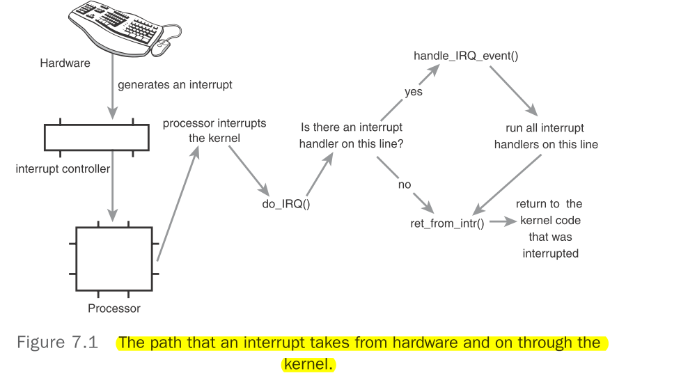 中断响应后,开始执行中断程序,也即是:interrupt handler 又称为 interrupt service routine (ISR)。其中,这个ISR是写在中断驱动里面的(driver)。