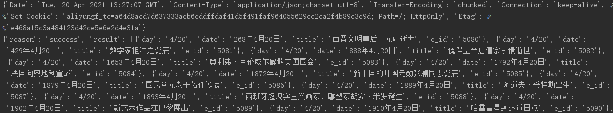# coding=utf-8 ''' 历史上的今天AppKey:key 接口文档地址 https://www.juhe.cn/docs/api/id/63 接口地址:http://v.juhe.cn/todayOnhistory/queryEvent.php 返回格式:json 请求方式:get 请求示例:http://v.juhe.cn/todayOnhistory/queryEvent.php?key=YOURKEY&date=1/1 接口备注:根据日期查询事件 ''' import requests import datetime time = datetime.datetime.now().timetuple() data_time = str(time.tm_mon) + "/" + str(time.tm_mday) key = "key" def Query_Event(): url = "http://v.juhe.cn/todayOnhistory/queryEvent.php" params = { "key":key, "date":data_time } res = requests.get(url,params=params) print(res.url) print(res.request) print(res.headers) print(res.json()) return res.text print(Query_Event())