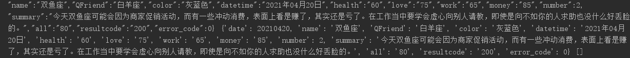 # coding=utf-8 ''' 星座 AppKey:key 接口文档地址 https://www.juhe.cn/docs/api/id/58 接口地址:http://web.juhe.cn:8080/constellation/getAll 返回格式:json 请求方式:http get 请求示例:http://web.juhe.cn:8080/constellation/getAll?consName=%E7%8B%AE%E5%AD%90%E5%BA%A7&type=today&key=申请的KEY ''' import requests types = ["today","tomorrow","week","month","year"] key = "key" consName = "双鱼座" url = "http://web.juhe.cn:8080/constellation/getAll" for type in types: params = { "type": type, "key": key, "consName": consName } res = requests.get(url, params=params) print(res.url,res.text,res.json(),res.history)