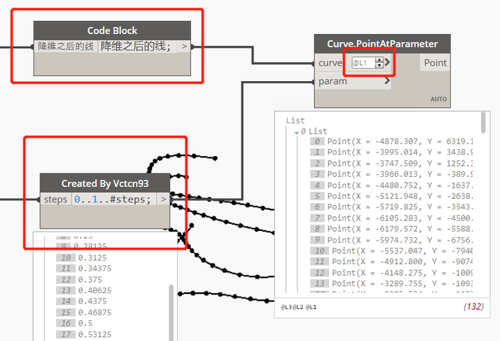 ➤ 然后再使用针对样条曲线的节点 Curve.PointAtParameter 获得在这些值上的点,便得到了我们需要的点阵。