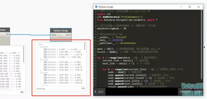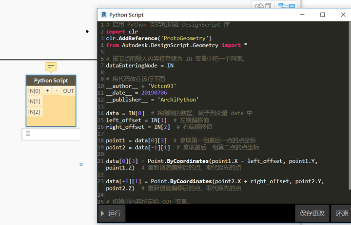 ➤ 由于 Dynamo 自带的节点更改数据十分麻烦,所以我们再请出 Python 写一个脚本,修改目前点数组中,第一组第4点,以及最后一组第2点的值,给它们做一个偏移。