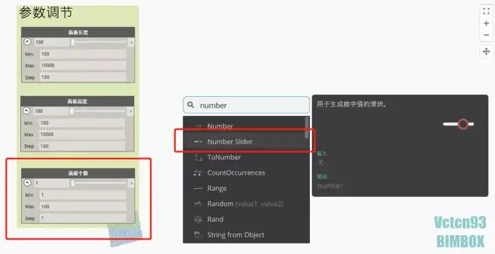 ➤ 这些参数当然不能一个个手动输入,所以在一开始,我们就把这三个参数做成 Number Slider 节点,放置到界面的最左边,把它们重命名,并编组为 参数调节: