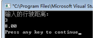 #include<stdio.h> main() { float s,l; printf("输入的行驶距离:\n"); scanf("%f",&l); if(l<=3) s=8; else s=(l-3)*1.6+8; printf("%.2f\n",s); }
