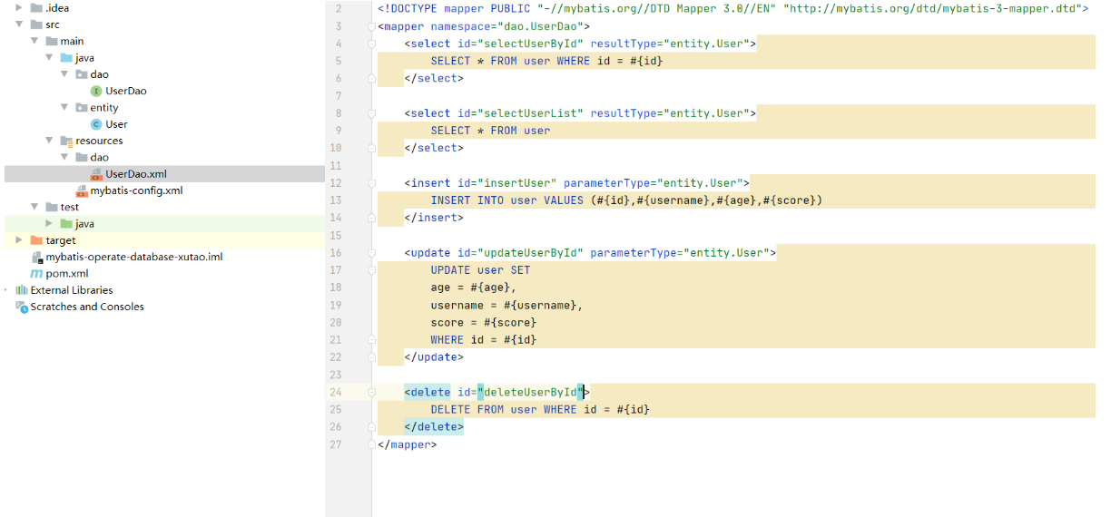 在resources文件夹下新建dao包,并在其下新建User模块Dao层配置文件:UserDao.xml