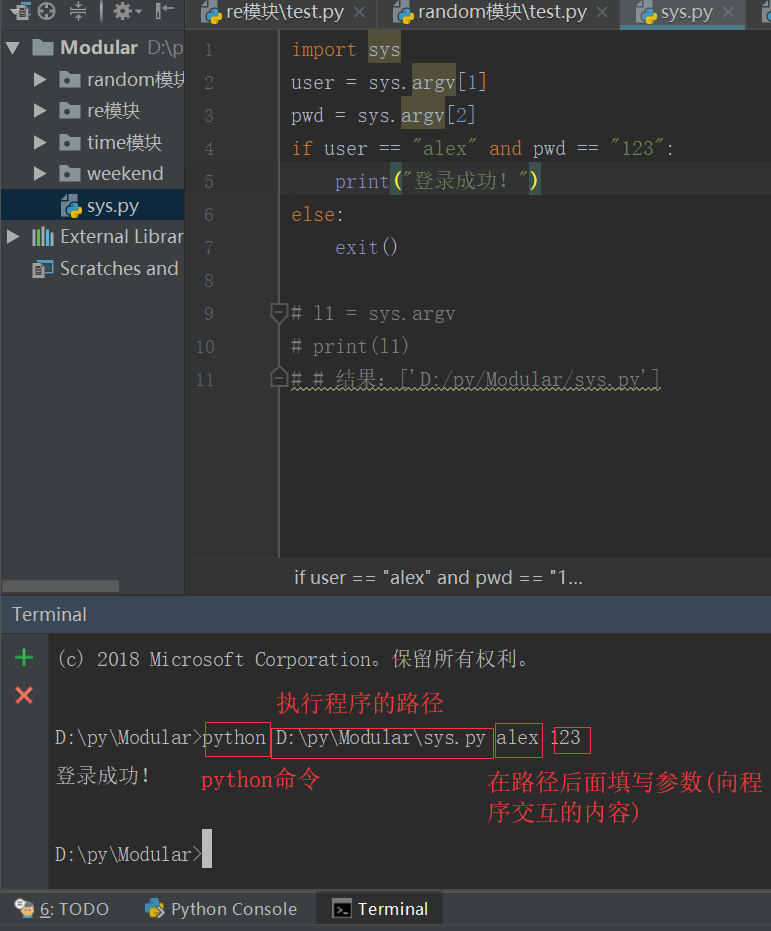 import sys user = sys.argv[1] pwd = sys.argv[2] if user == "alex" and pwd == "123": print("登录成功!") else: