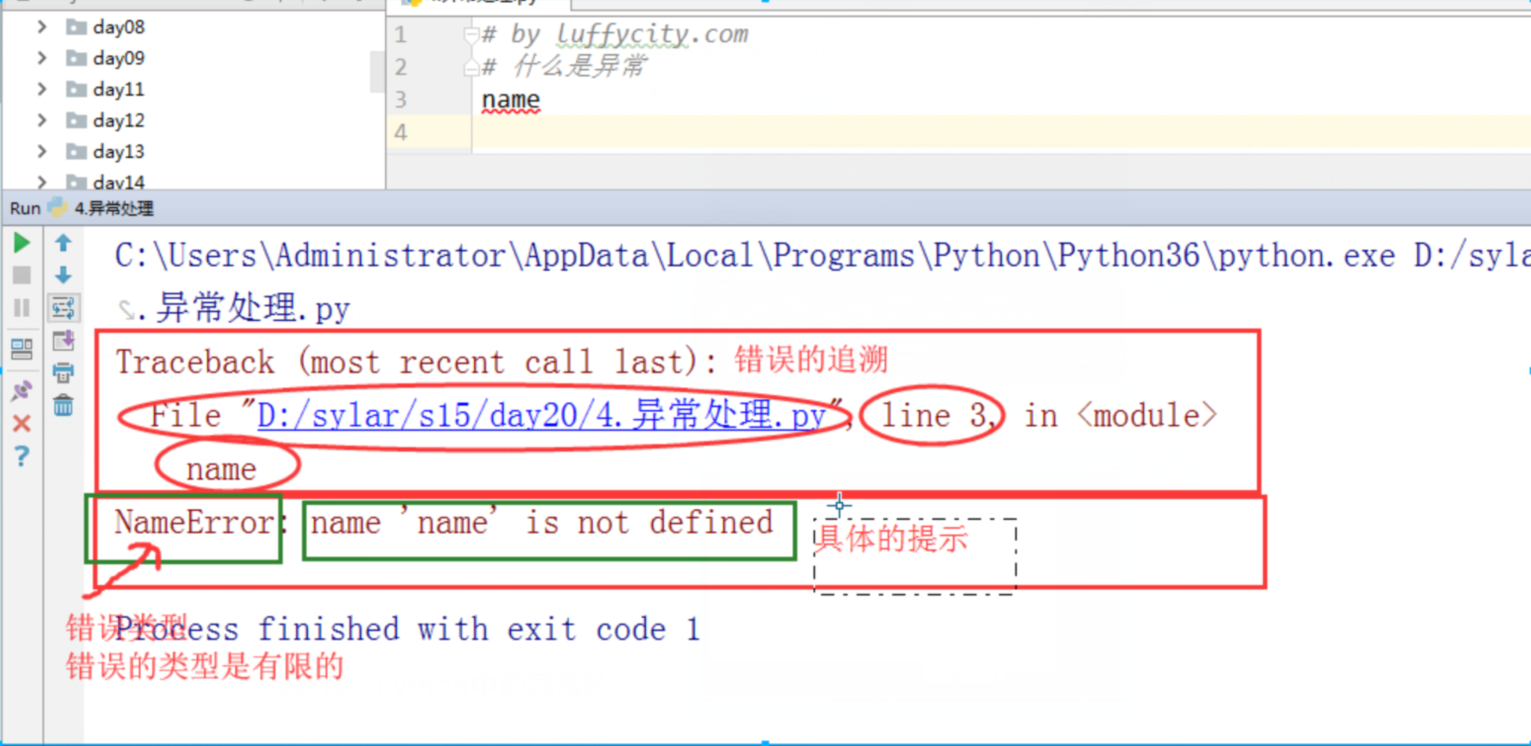 python解释器去执行程序,检测到了一个错误时,触发异常,异常触发后且没被处理的情况下,程序就在当前异常处终止,后面的代码不会运行,谁会去用一个运行着就崩溃的软件。