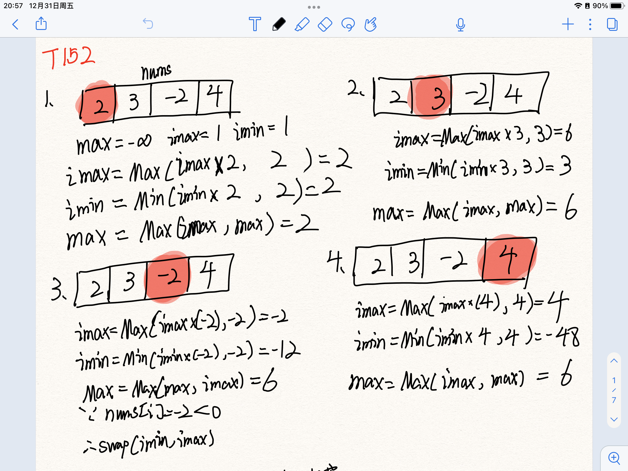 因此设置imax与imin维护当前最小值与最大值,当遇到负数时交换,达到求解目的。