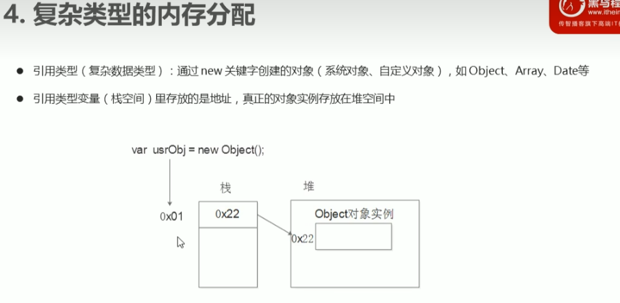 复杂数据类型存入堆,首先在栈里存放地址,这个地址指向堆的真正数据。