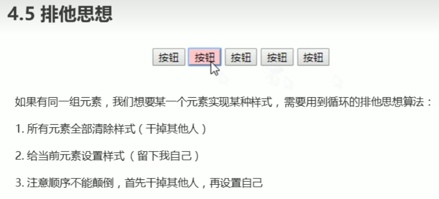 排他思想:先排除其他元素样式,再设置自身样式。