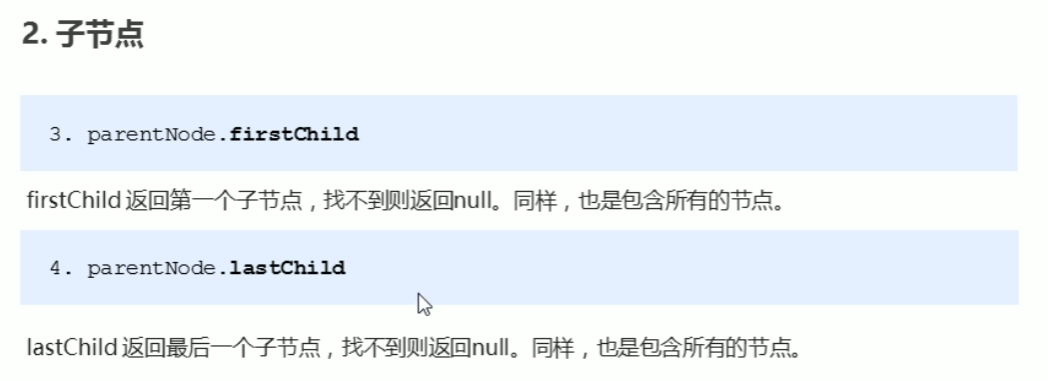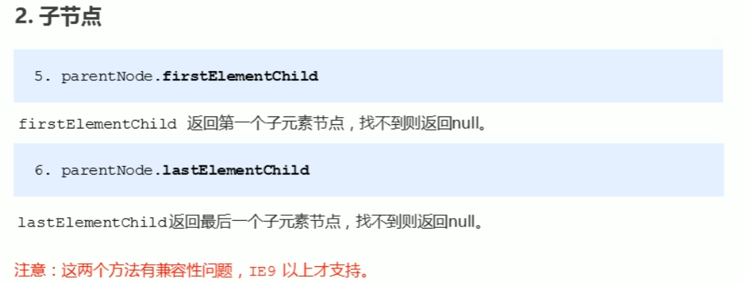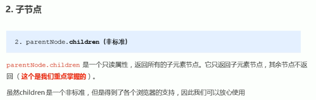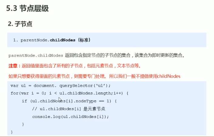 子节点方法:childNodes标准方法但会同时返回元素节点和文本节点,需要通过nodeType的值进行处理取值。