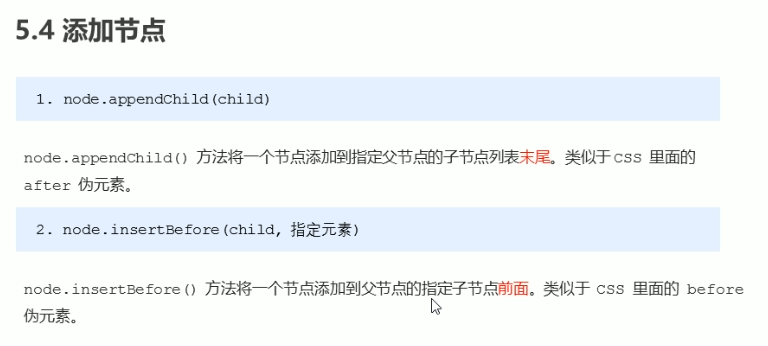 添加节点:appendChild相当于after伪元素,insertBefore相当于before伪元素。